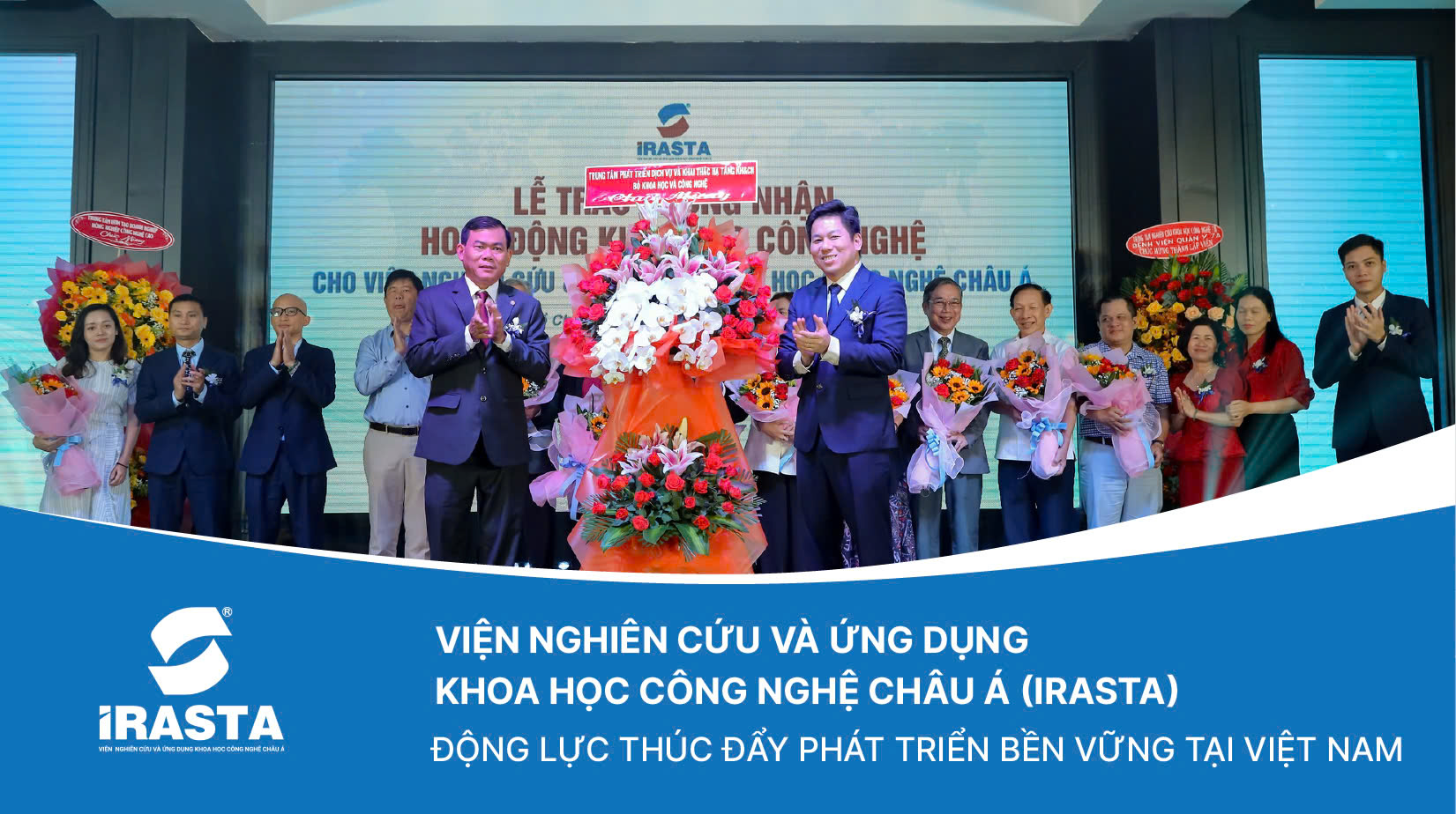 Ngày 11/10/2024, tại TP. Hồ Chí Minh, Viện Nghiên Cứu và Ứng Dụng Khoa Học Công Nghệ Châu Á (IRASTA) đã chính thức đón nhận chứng nhận hoạt động khoa học công nghệ. Đây là một sự kiện đặc biệt không chỉ với riêng viện mà còn với cả cộng đồng khoa học công nghệ Việt Nam, đánh dấu bước tiến mới trong việc thúc đẩy phát triển bền vững, sản xuất và tiêu dùng xanh tại Việt Nam. Buổi lễ có sự tham dự của đại diện các cơ quan quản lý nhà nước, các nhà khoa học hàng đầu và nhiều đối tác chiến lược của IRASTA.